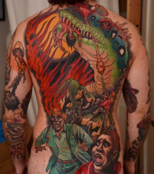 背部卡通风格彩色邪恶龙与可怕人类纹身图案
