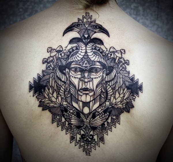 背部雕刻风格黑色线条鸟类蛇和神秘脸纹身图案