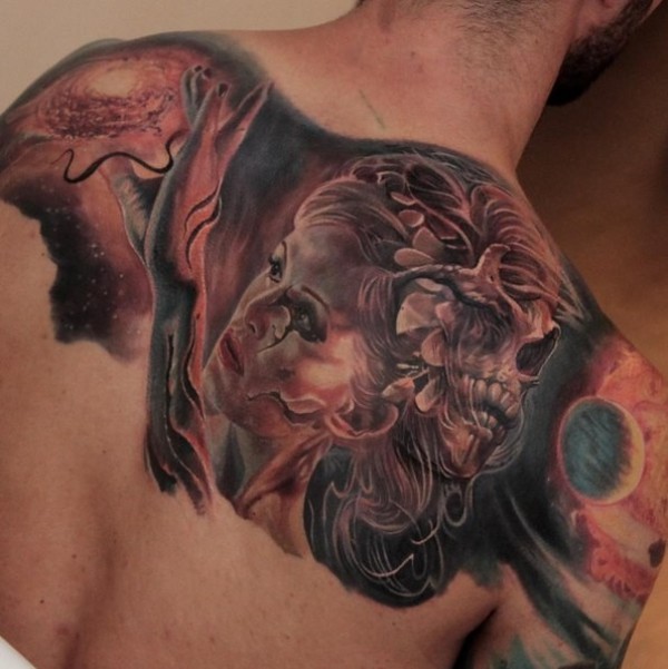 背部彩色的神秘女子与行星骷髅纹身图案