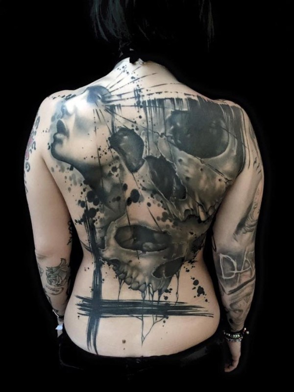 背部令人难以置信的骷髅与女人肖像纹身图案