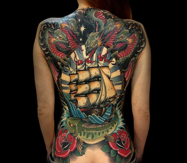 背部new school彩色帆船与邪恶的蛇鱼和玫瑰纹身图案