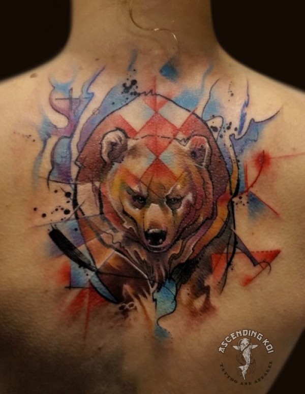 背部水彩风格的大熊纹身图案
