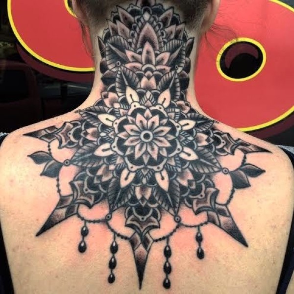 背部和颈部黑色old school梵花纹身图案
