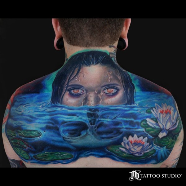 背部新风格彩色游泳女性与骷髅莲花纹身图案