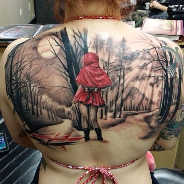 写实风格彩色小女孩在黑暗森林背部纹身图案