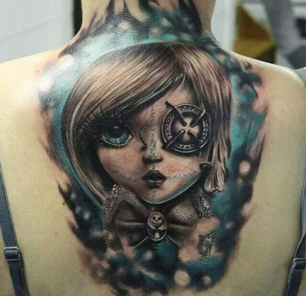 背部新风格彩色的幻想女子与眼睛徽章纹身图案