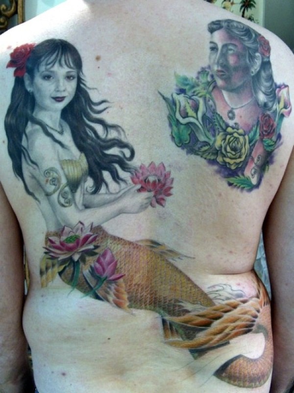 背部插画风格彩色的美人鱼与女性肖像纹身图案