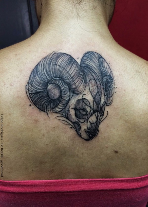 背部雕刻风格黑色的小山羊头与心脏纹身图案