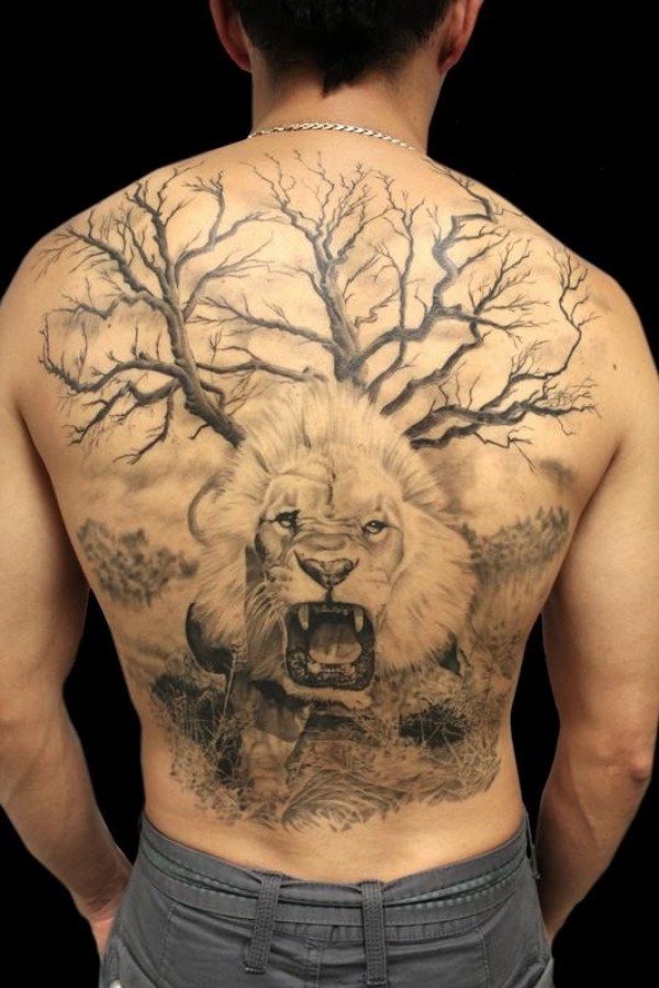 写实风格栩栩如生的咆哮狮子和大树背部纹身图案