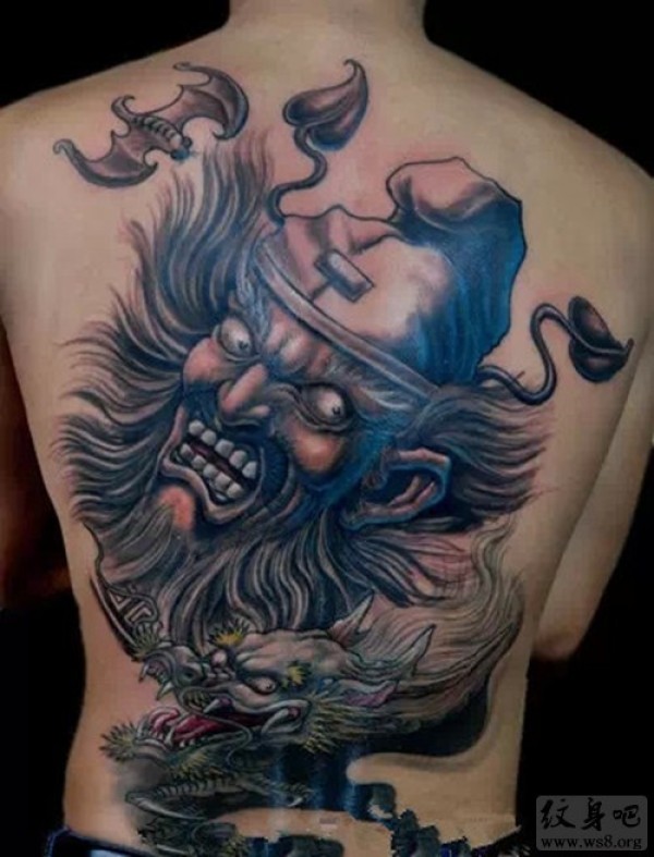 背部令人毛骨悚然的龙和蝙蝠纹身图案