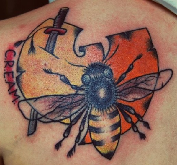 背部卡通风格的彩色蜜蜂和有趣的符号纹身图案