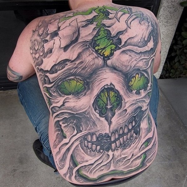 背部彩色的神秘骷髅与植物纹身图案
