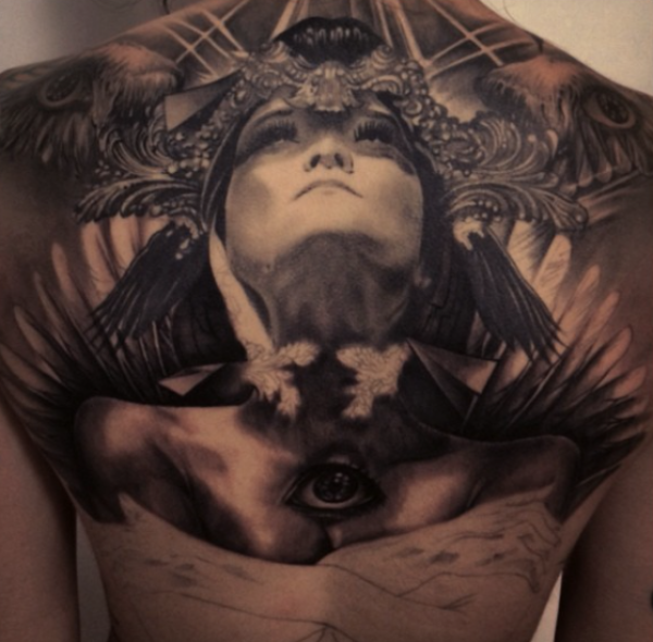 背部巨大神秘的古代女性与金字塔和眼睛纹身图案