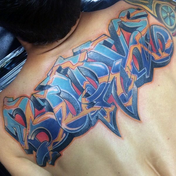背部彩色的涂鸦字体纹身图案