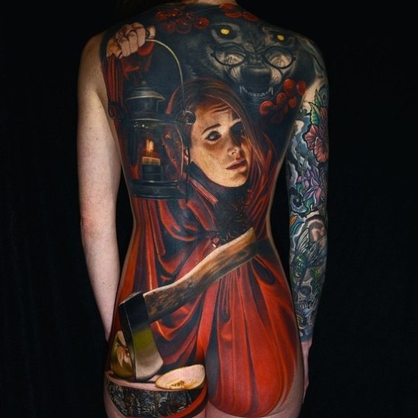 背部写实风格的彩色女人斧头和怪物纹身图案