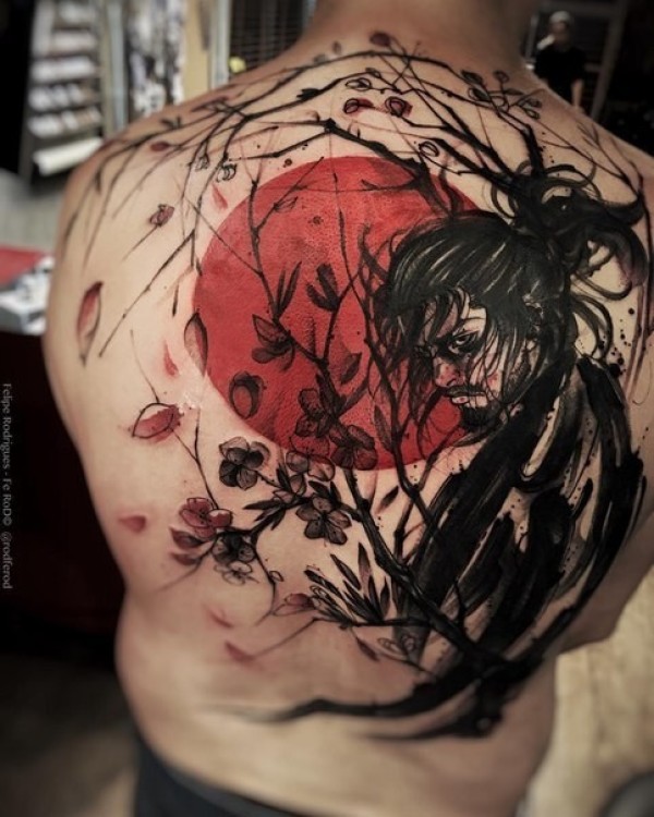 背部日式的彩色武士与花朵太阳纹身图案