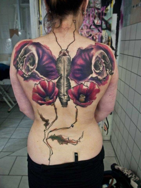 背部现代传统风格的蝴蝶与骷髅花朵纹身图案
