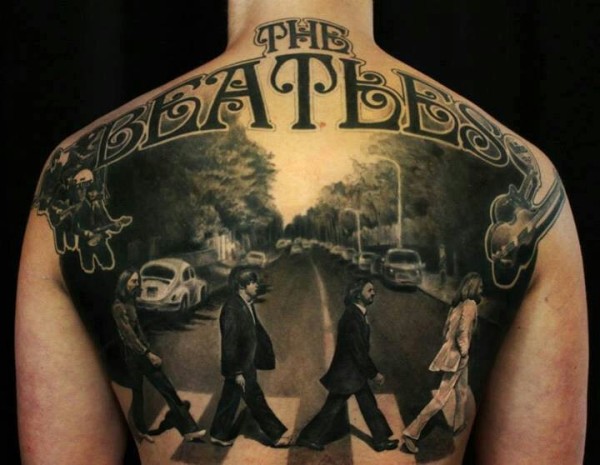 背部黑灰披头士乐队人物写实纹身图案