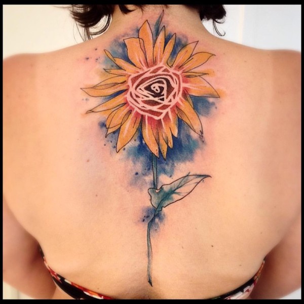 背部卡通风格的彩色漂亮的向日葵纹身图案