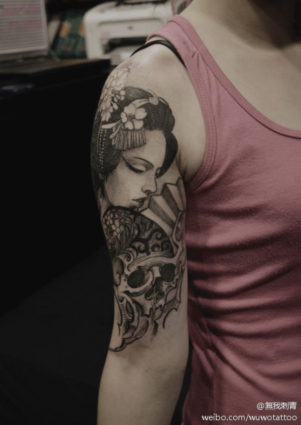 男人大臂黑白彼岸花骷髅_黑白纹身图案大全_纹身图吧