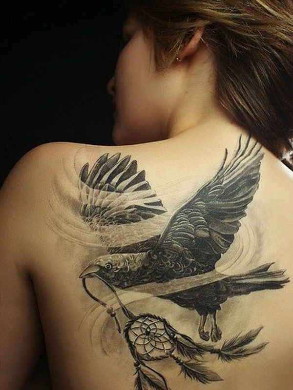 背部写实风格的黑白乌鸦与捕梦网纹身图案