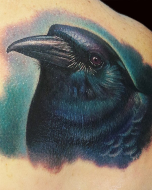 背部插画风格斑斓的彩绘乌鸦纹身图案