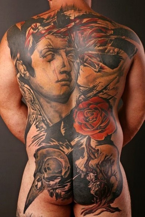 满背old school彩色雕像和花朵鸟头骨纹身图案
