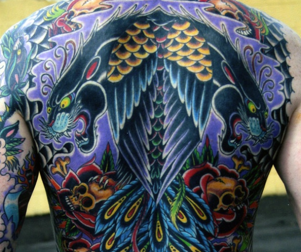 背部new school彩色的黑豹与骷髅羽毛纹身图案