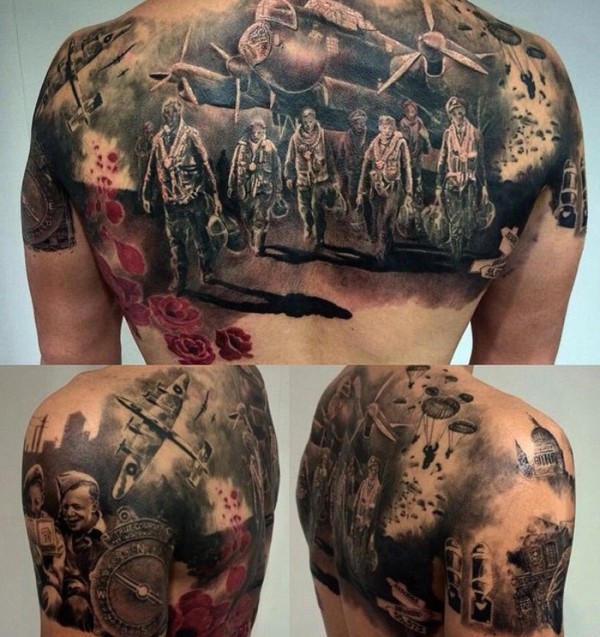 背部写实风格的彩色二战飞行员和飞机纹身图案