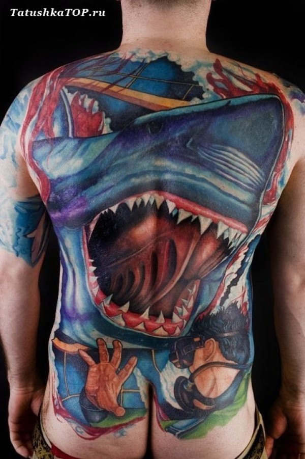 满背大型的彩绘鲨鱼与潜水员纹身图案