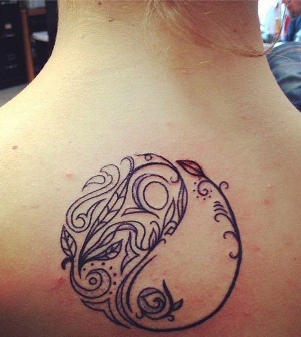 背部黑白藤蔓组合的阴阳八卦符号纹身图案