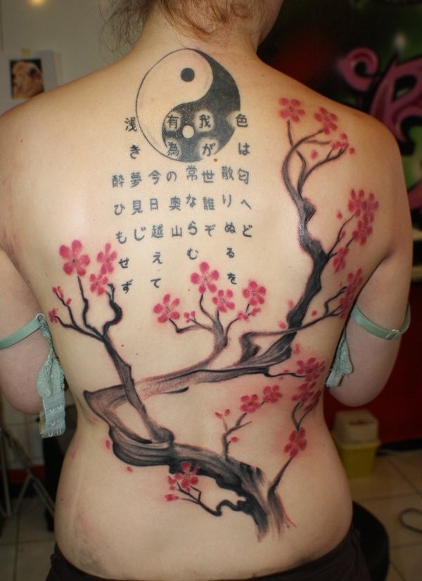 背部日本传统色的阴阳八卦和樱花树字符纹身图案