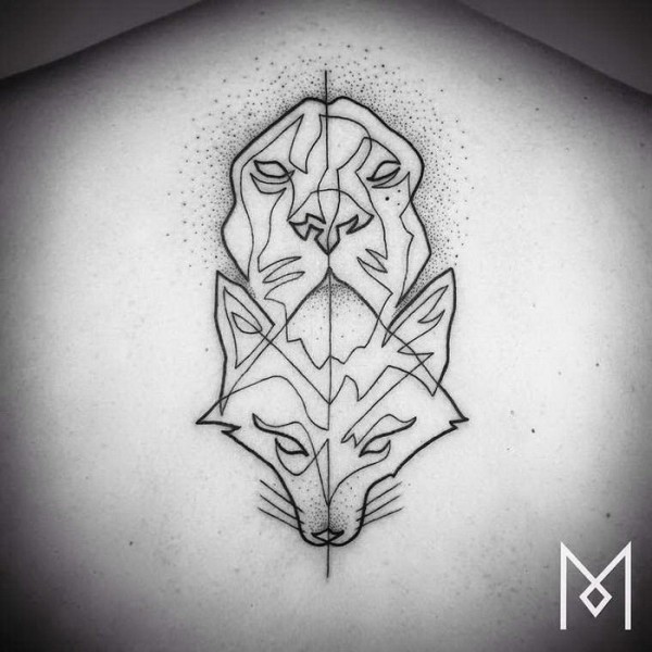 背部点刺风格黑色线条狐狸和狮子头纹身图案