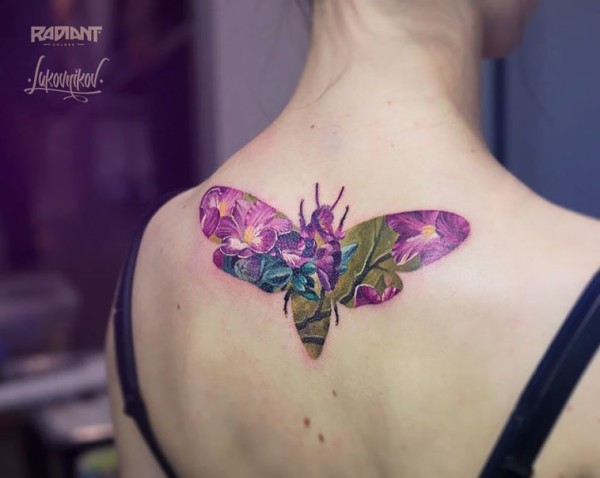 背部可爱的彩色蜜蜂与花朵纹身图案