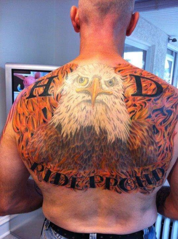 背部new school插画风格彩色火焰鹰纹身图案