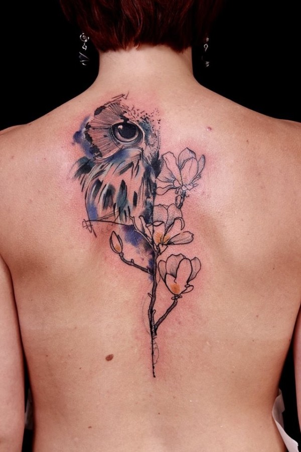 背部插画风格彩色的猫头鹰与花蕊纹身图案
