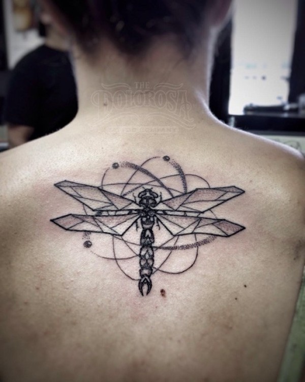 背部点刺风格几何蜻蜓纹身图案