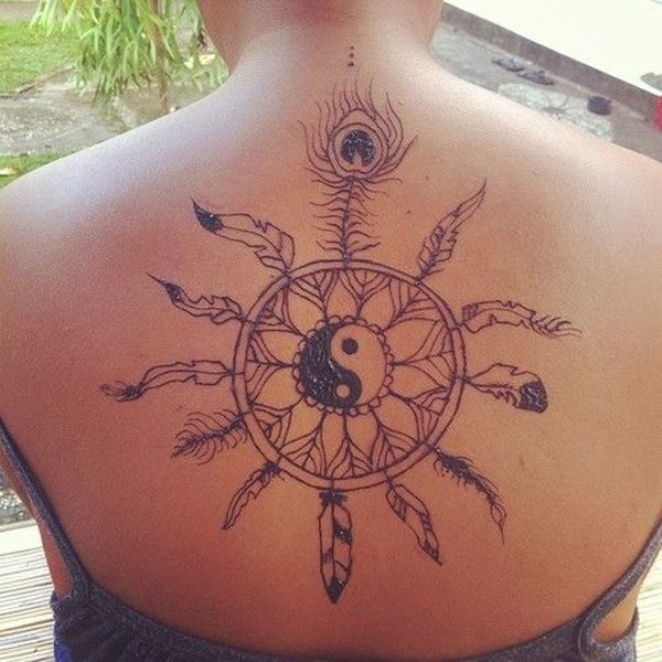 背部黑色的阴阳八卦风格的捕梦网纹身图案