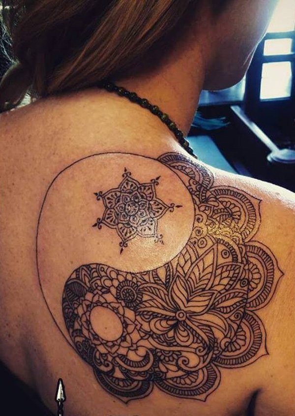 背部黑色的阴阳八卦符号组合梵花纹身图案