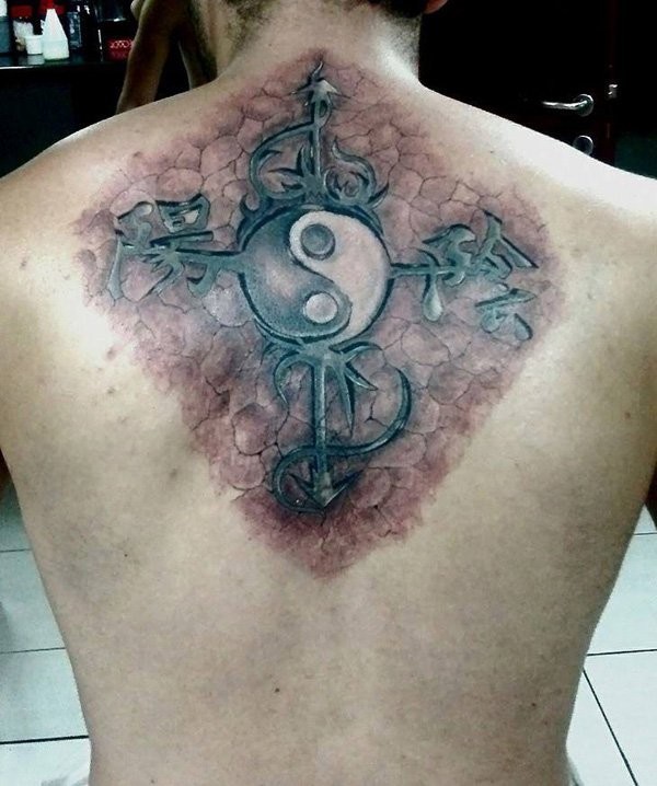 背部写实风格的汉字与阴阳八卦符号纹身图案