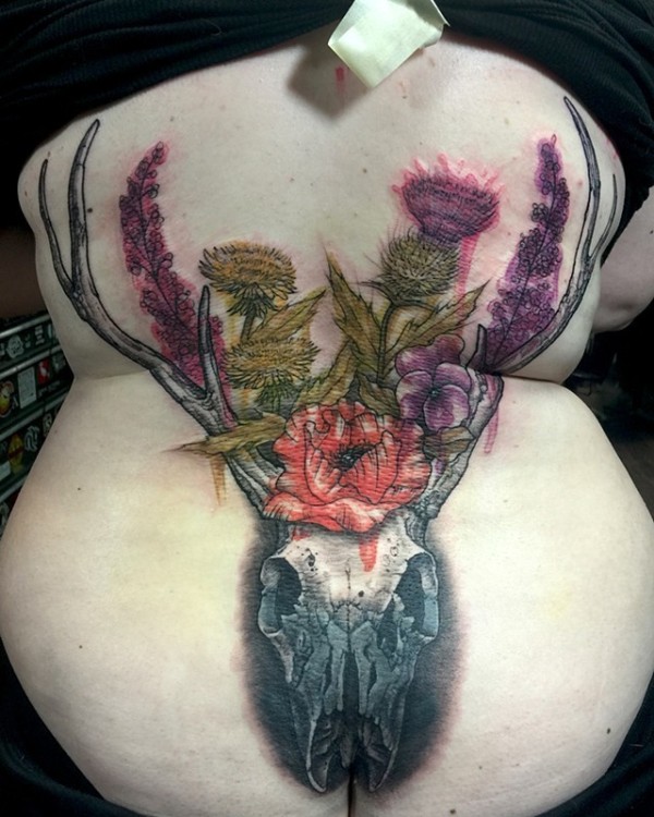 背部写实风格的大型彩色鹿头骨和野花纹身图案