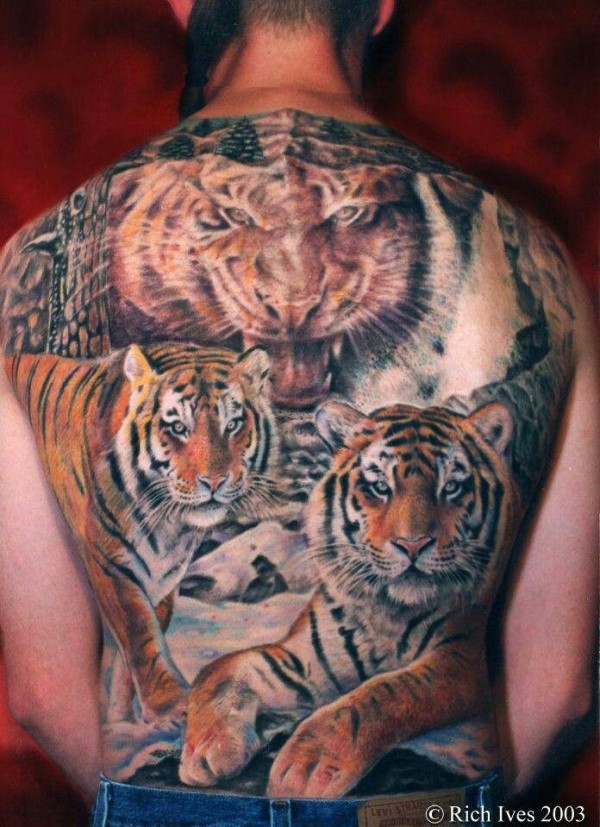 背部惊人的写实风格彩色大老虎家族纹身图案