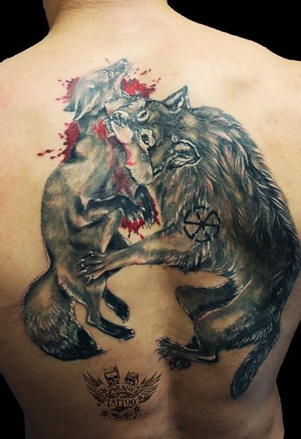 背部惊人的写实风格彩色狼与狐狸血腥纹身图案