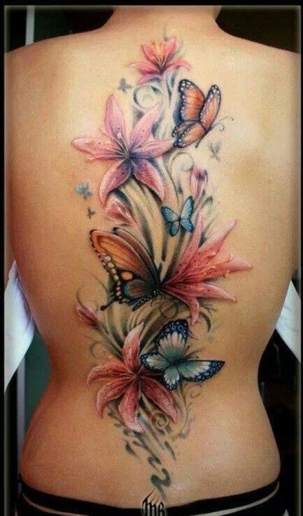 背部彩色的写实风格各种花卉和蝴蝶纹身图案