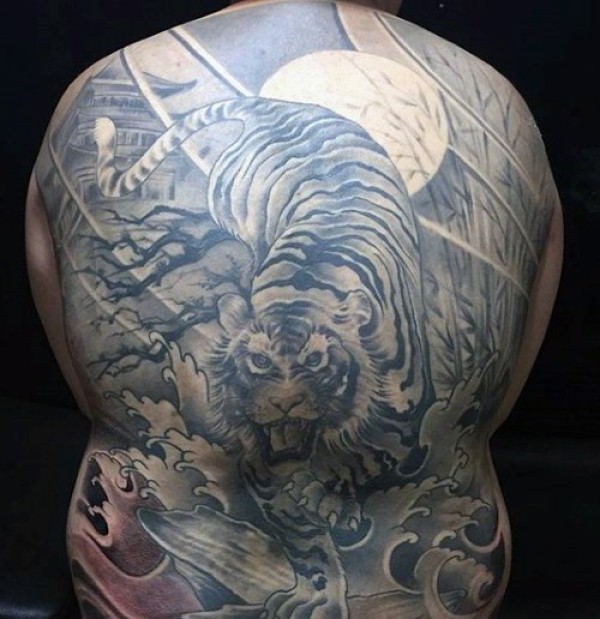 背部新日本风格黑色森林中的老虎纹身图案