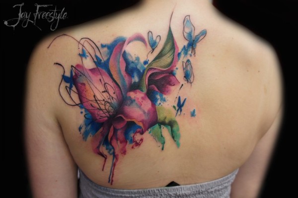 背部美丽的彩色各种花卉纹身图案