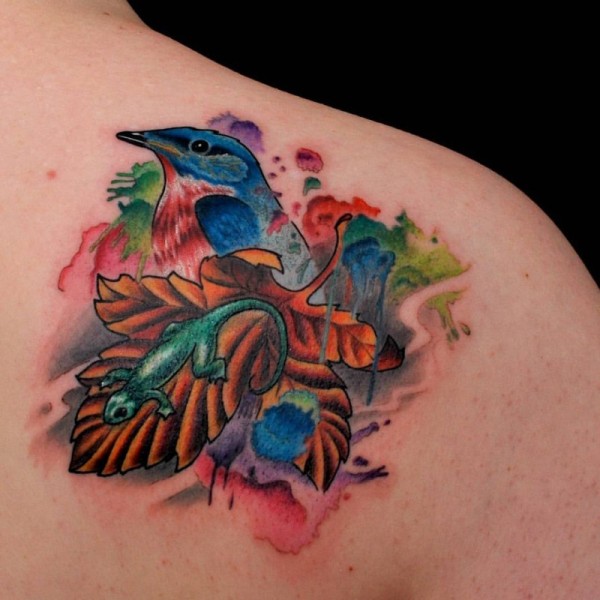 背部彩色的小鸟与蜥蜴和树叶纹身图案