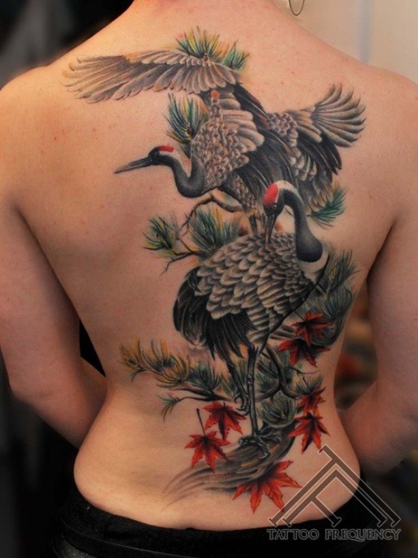 背部令人惊叹的写实风格彩色仙鹤树枝纹身图案