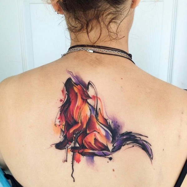 背部令人难以置信的水彩风格彩色狐狸纹身图案