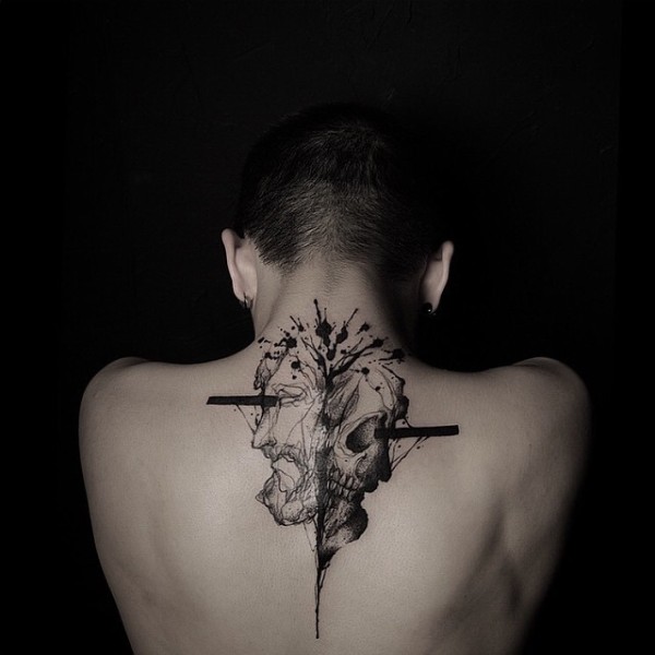 背部神秘的黑色雕刻风格半人半骷髅纹身图案